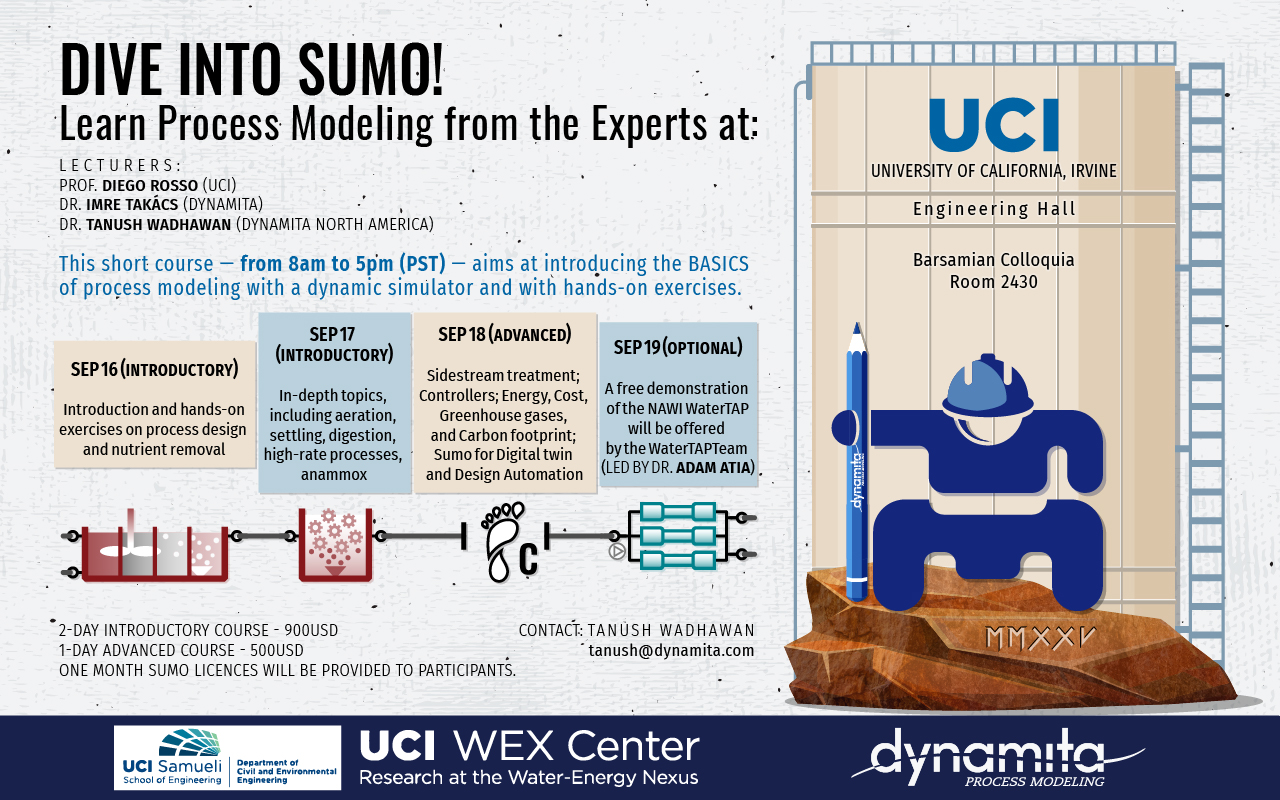 The University of California, Irvine WEX Center is once again organizing two process modeling courses. The SUMO course will be from 16-18 September, either introductory, advanced or both! To sign up or to find out more, write to tanush[at]dynamita.com