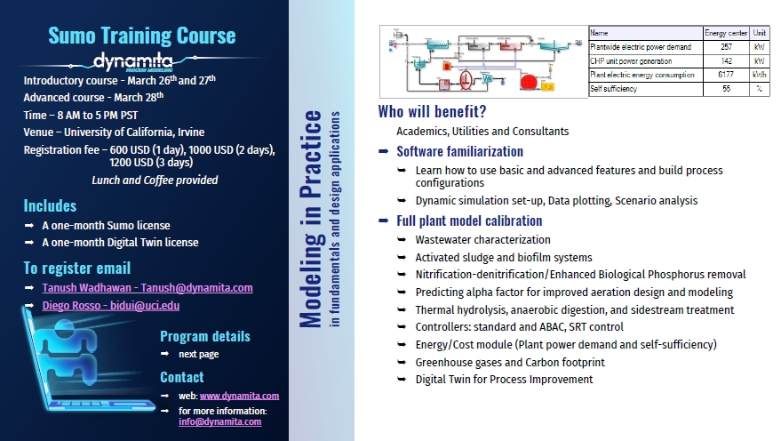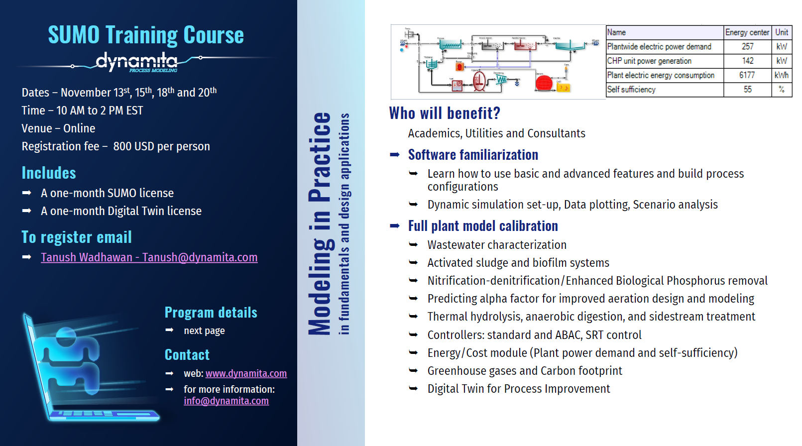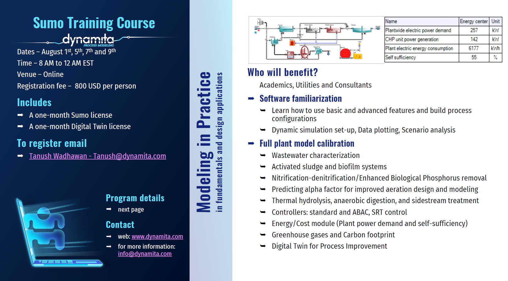 Dynamita will be holding an online training course in August. Familiarize yourself with SUMO and learn about full plant model calibration with Tanush. This general introductory training is open to anyone who can be awake and alert at 8am EST! See the flyer for all the details.
